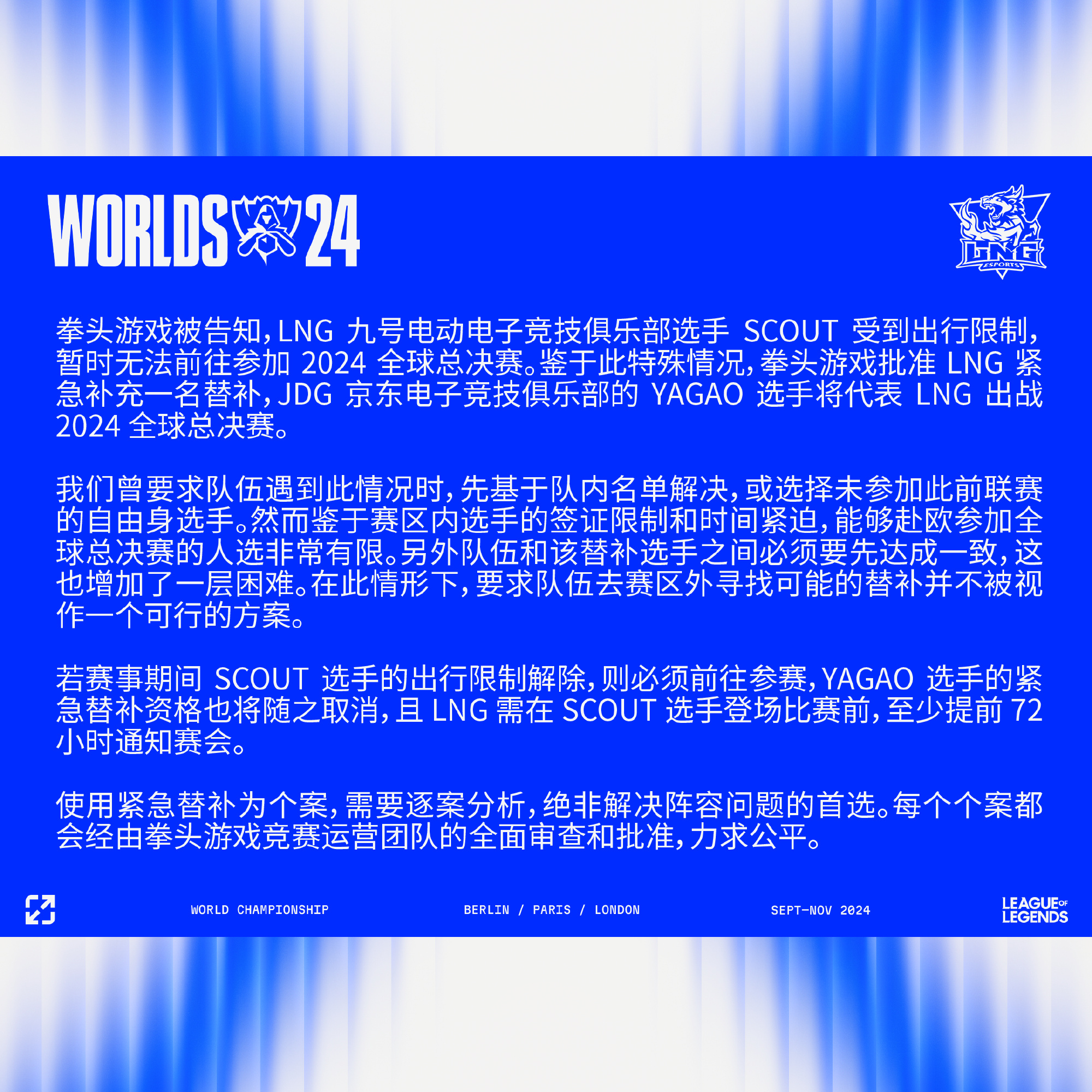 LNG队中的中单选手Scout因为与前队伍EDG的合同纠纷,被限制出境。官方公告称,Yagao将代替Scout成为LNG的紧急替补参赛,但如果Scout能解除限制,Yagao的参赛资格也将被取消。