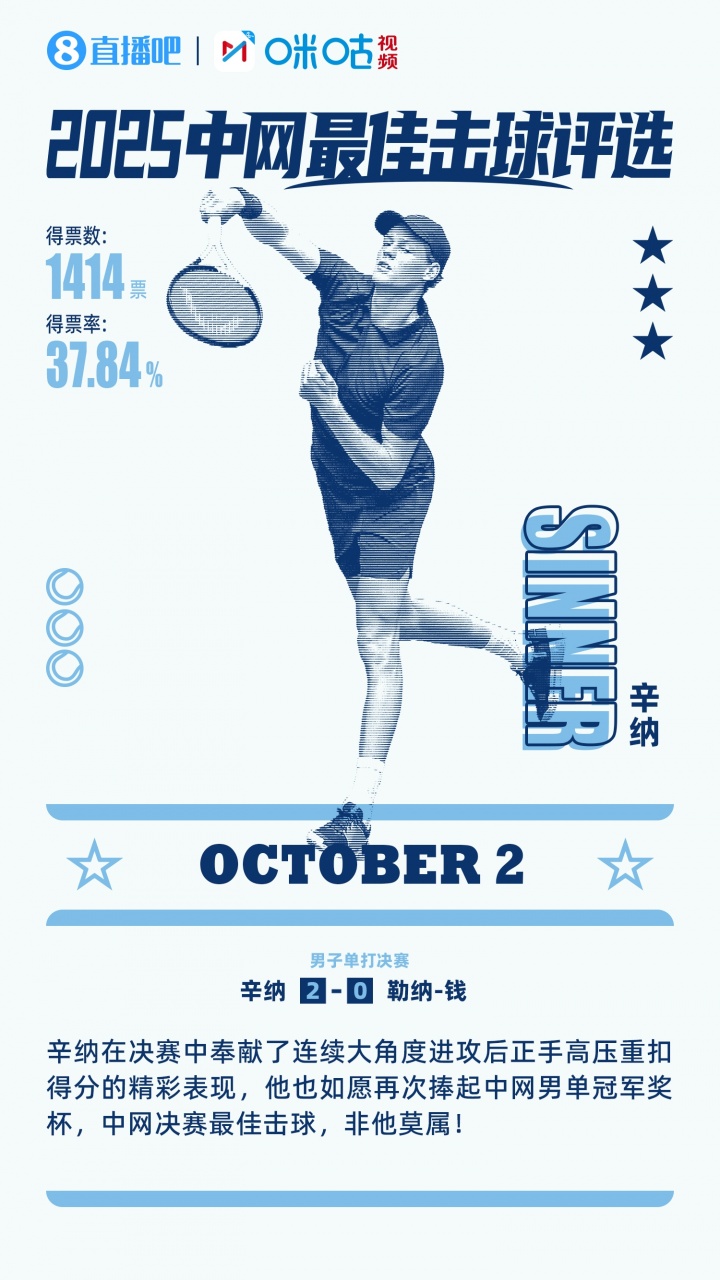 2025年中國網球公開賽正在北京如火如荼地進行,期間與咪咕體育合作,推出了每輪的“中網最佳擊球”評選活動。結果不得不說還真是無愧於“盛典”,辛納以其令人嘆為觀止的連續大角度進攻,緊接著來了一記正手高壓砸地得分,憑借這一高難度的操作贏得了近四成吧友的青睞,毫無懸念地當選ATP決賽的“中網最佳擊球”!看來,辛納這一手真是把“進攻”這個概念演繹到了極致,像是在展示擊球藝術的博物館。