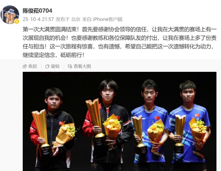 10月4日,中華乒壇的陳俊崧在他的社交媒體上發聲,似乎是在慶祝他在本屆WTT中國大滿貫的“輝煌”表現。陳某不僅感謝了乒協領導的信任,仿佛在說:“謝謝你們讓我在大滿貫的舞臺上展現自我”,同時,他也不忘提到教練與“保障隊友”的辛苦付出,聽起來就像是在給那些背後默默無聞的人頒發了個參與獎。