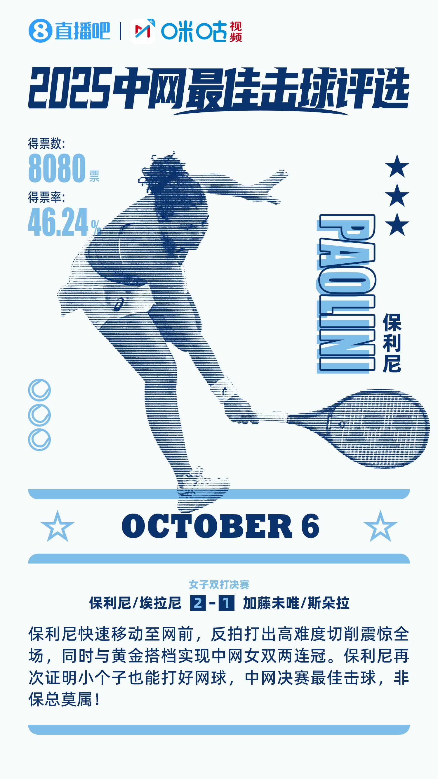 在10月6日的投票環節中,來自中國的網球選手保利尼以一記高難度的反拍切削球驚艷全場,與搭檔合作斬獲了中網女雙的兩連冠。這次精彩的擊球贏得了46%的投票支持,毫無懸念地成為當天的#中網最佳擊球#。