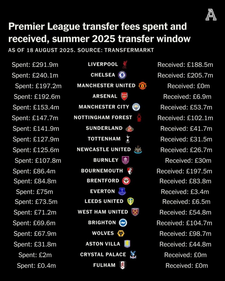 截至8月18日,英超各隊在夏季轉會窗口的收支情況已有明確統計,其中利物浦以支出2.9億英鎊位居支出排行榜之首。而曼聯則以凈支出1.97億英鎊成為本窗口的最大支出方。