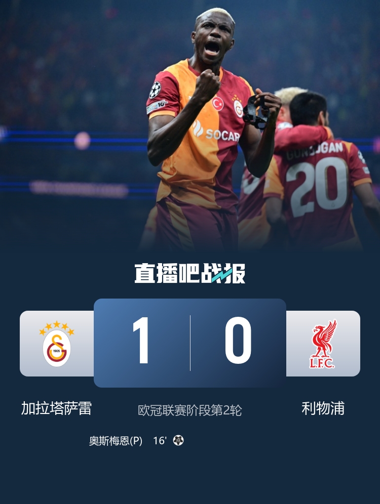 10月1日淩晨3時,歐冠小組賽第二輪在土耳其電信球場進行,利物浦客場對陣加拉塔薩雷。首半場,利物浦經歷了一次意外的判罰,索博斯洛伊在回追防守時犯規,導致加拉塔薩雷獲得點球機會,由奧斯梅恩主罰命中。此時,加克波也錯過了一次絕佳的得分機會。半場結束,利物浦以0-1落後於對手。