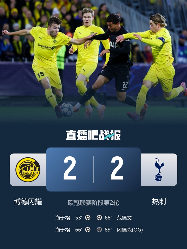 在歐冠聯賽小組賽第二輪中,博德閃耀在主場阿斯米拉體育場與熱刺展開角逐,最終戰成2-2平局,雙方為球迷奉獻了一場跌宕起伏的比賽。