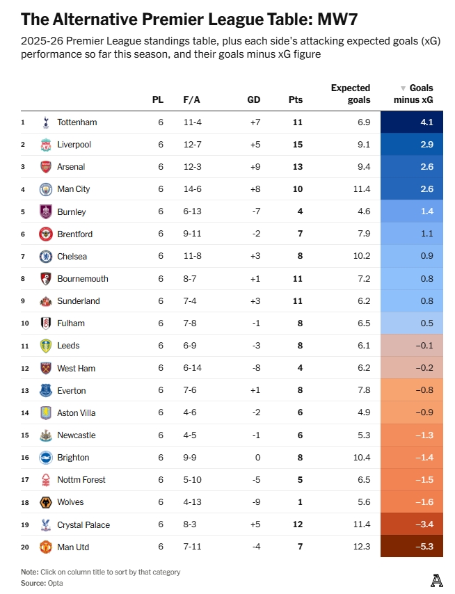 曼聯在英超聯賽的表現十分引人註目,根據The Athletic的數據統計,該隊的預期進球數為12.3球,而實際進球數僅為7球,成為英超中預期進球與實際進球差距最大的球隊。本賽季,曼聯在聯賽中的場均預期進球為2.05,部分原因歸功於姆伯莫和庫尼亞的加盟。此外,曼聯的射門數量也令其處於聯盟領先,場均達到15.3次,這一數字是所有球隊中最高的。然而,他們的射門主要來自禁區外,這雖然會提高預期進球數,但往往質量不高,難以轉化為實際進球。