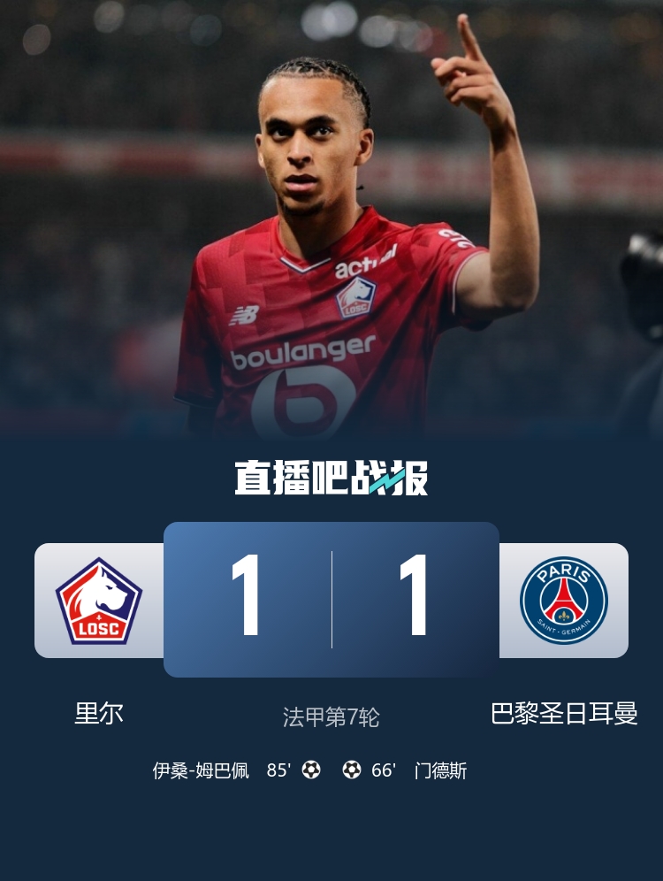 10月6日,北京時間2:45,法甲第7輪的比賽中,裏爾主場迎戰巴黎聖日耳曼。比賽上半場,雙方都未能創造出有威脅的進攻機會。進入下半場,替補出場的努諾-門德斯在第66分鐘為巴黎送上一腳精彩的任意球破門,幫助球隊取得領先;而姆巴佩也現身觀眾席為弟弟伊桑-姆巴佩加油。最終,伊桑在第85分鐘為裏爾打入扳平進球,比賽以1-1的平局收場。