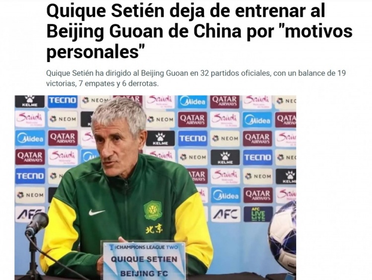 西班牙媒體《馬卡報》和《世界體育報》最近發出了一個讓人感到意外的消息,北京國安的主教練基克·塞蒂恩因個人和家庭原因,決定辭去他的教練職務。如今,這位曾經的西甲名帥,在經過深思熟慮之後,做出了這一艱難的決定。