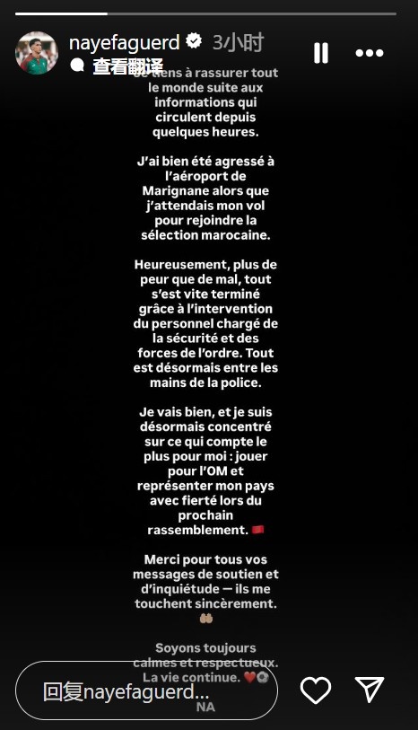 馬賽的後衛阿格德在周一經歷了一場令人震驚的事件,他在馬裏尼亞納機場等待飛往摩洛哥國家隊的航班時,竟被一名男子突襲。對此,他在社交平臺上進行了一番說明,告知大家自己的狀況。