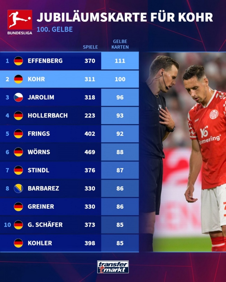 在這份排行榜中,還有沃恩斯,斯廷德爾,巴爾巴雷茲,格賴納,舍費爾以及科勒。沃恩斯在469場比賽中獲得了88張黃牌,而斯廷德爾則以376場比賽和87張黃牌緊隨其後。巴爾巴雷茲與格賴納並肩作戰,各自都有著86張黃牌的記錄,舍費爾在373場比賽中獲得了85張黃牌,科勒的398場同樣又是85張黃牌。