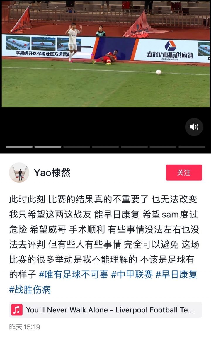 在這場比賽後的社交媒體上,廣西平果的球員姚棣然表達了他內心的沈重與無奈。他寫道:“此時此刻,比賽的結果已經變得微不足道,無法改變的。我只希望我的兩位戰友能夠早日康復,真心希望Sam(阿薩莫阿)能度過這個危險時期,也希望威哥(黃威)的手術一切順利。”他進一步指出,生活中的一些事情無法控制和評判,但有些傷害和事件本可以避免。他承認,很多比賽中的情況令他無法理解,足球本不該如此對待運動員。