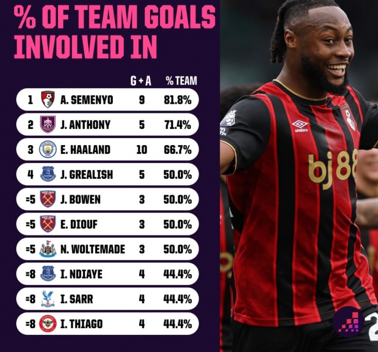 在這個賽季中,伯恩茅斯的邊鋒塞梅尼奧展現了他的非凡表現,勢頭如虹,成為球隊攻擊線上的關鍵一員。他的進攻貢獻令人矚目,根據OPTA的統計,塞梅尼奧參與的進球數量占據了全隊總進球的81.8%,這一數據在英超聯賽中遙遙領先,真正是球隊的“進攻發動機”。