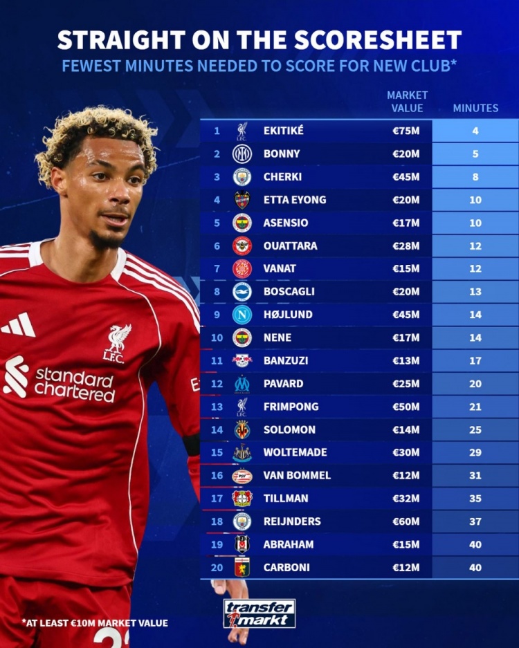 而在這張處子球榜單的排位賽中,博尼也不甘示弱,他在國米僅用5分鐘便得分,不過在埃基蒂克的光芒下,也只敢自嘆不如。而謝爾基在曼城的8分鐘,也許算是挑釁了一個不錯的開局,雖然不是特別亮眼,但至少比多數新援要好得多。