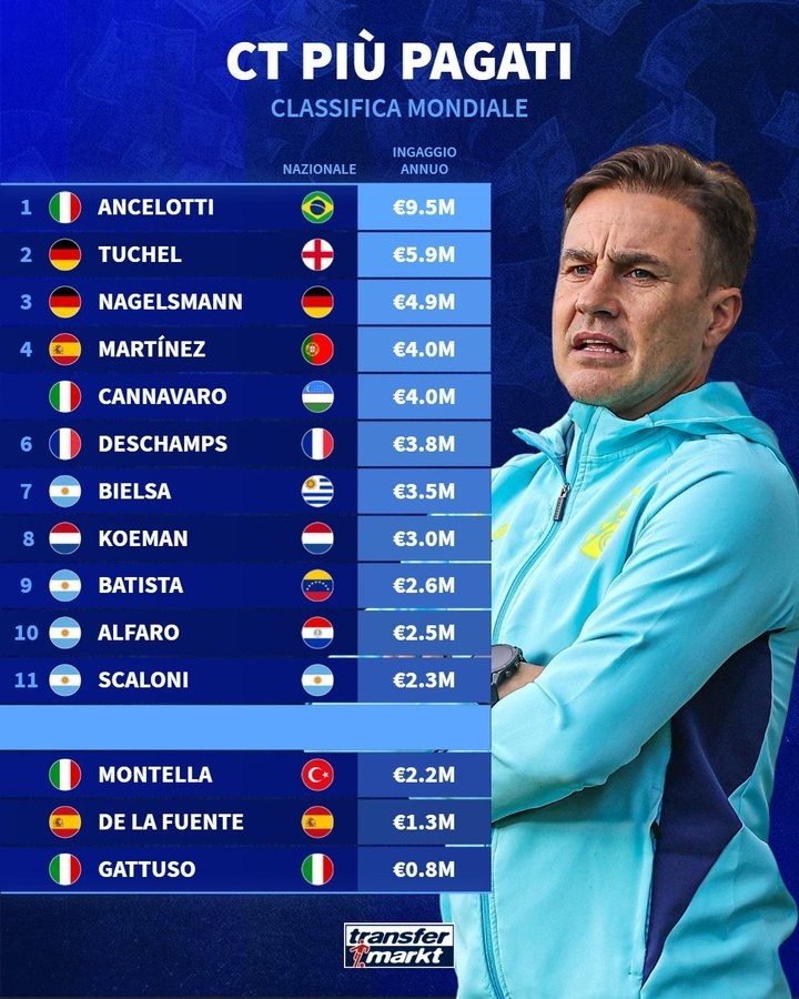馬丁內斯和卡納瓦羅同樣非常引人註目,他們分別執教葡萄牙和烏茲別克斯坦,年薪均為400萬歐元,體現出這兩位教練在全球舞臺上的價值。而德尚作為法國國家隊的領軍人物,年薪為380萬歐元,體現了他在帶領國家隊實現成功上所做的貢獻。