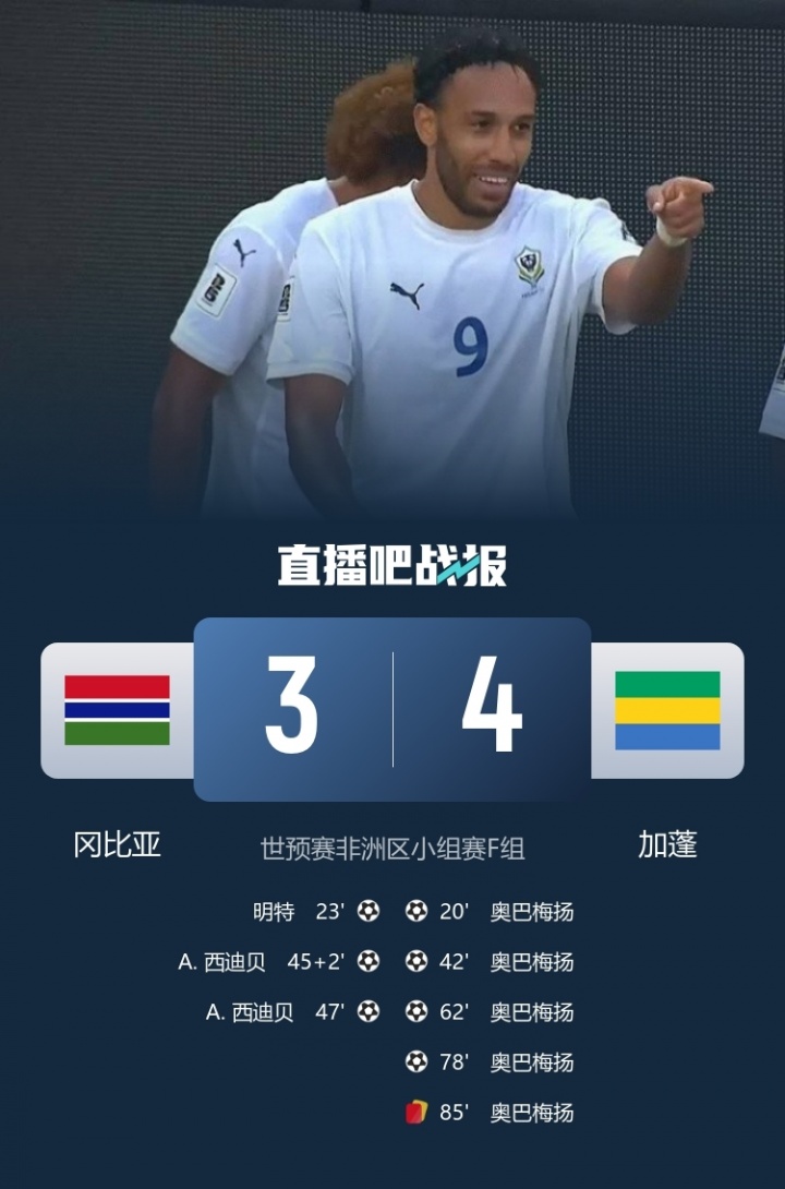 在10月10日舉行的世預賽非洲區F組第9輪中,加蓬以4-3的驚險比分戰勝了岡比亞,36歲的前鋒奧巴梅揚表現神勇,不僅打入四球,更是憑借個人的卓越表現為加蓬贏得了這一關鍵勝利。