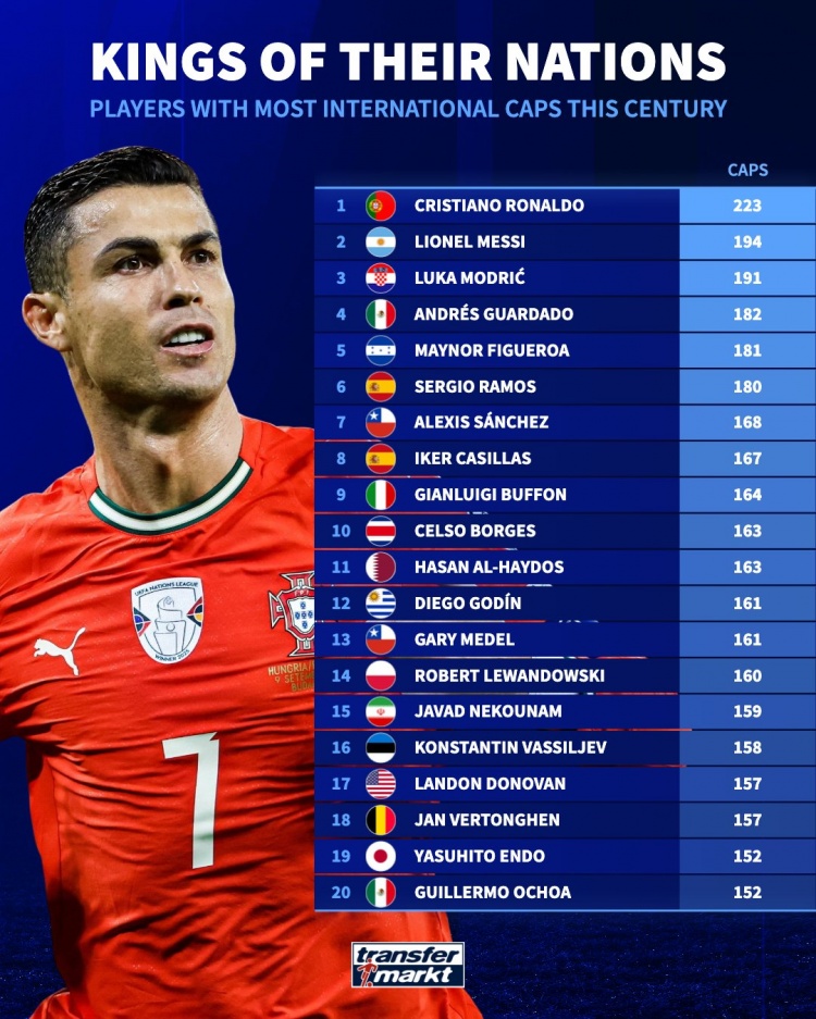在這個世紀的國際賽場上,湧現出了一批足球巨星,他們以無與倫比的技術和堅持不懈的精神,書寫了一段段傳奇。德轉最新的統計讓我們看到了這20位球員在國際比賽中光輝的出場次數,令人震撼。