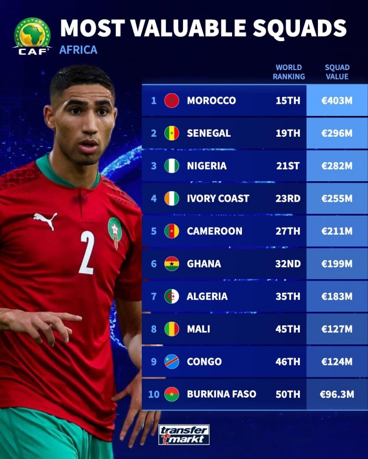 榜單中,還可以看到科特迪瓦的身影,他們以2.55億歐元的身價排名第四,昔日的輝煌依舊在延續。接下來是喀麥隆,2.11億歐元展現了這支球隊的韌性與實力。在這些國家之後,加納以1.99億歐元的身價不甘示弱,南非足球的流派與傳統在這裏得到了完美的展示。