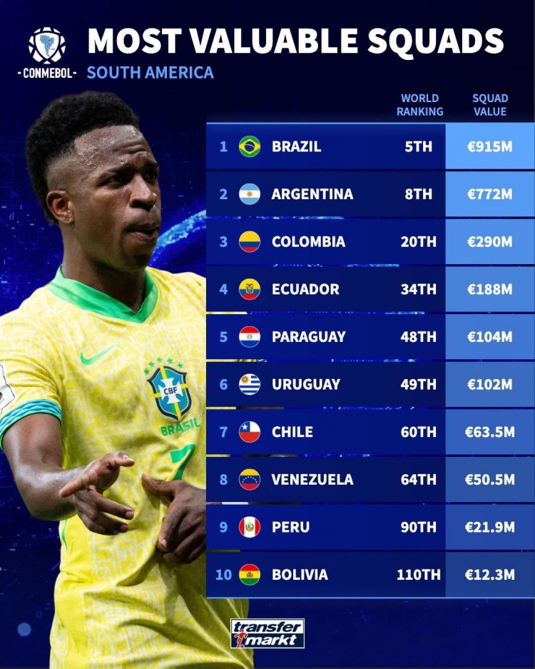 縱觀整個南美大陸,各國球隊如同星辰般璀璨,各自閃爍著獨特的光芒。哥倫比亞以2.9億歐元的總身價位列第三,盡管他們在國際足聯排名中為第20位,卻依然展現出了不可小覷的實力。而厄瓜多爾和巴拉圭兩強,則在這片沃土上勉力拼搏,分別以1.88億歐元和1.04億歐元的身價緊隨其後,為這一輪賽事增添了更多的懸念和期待。