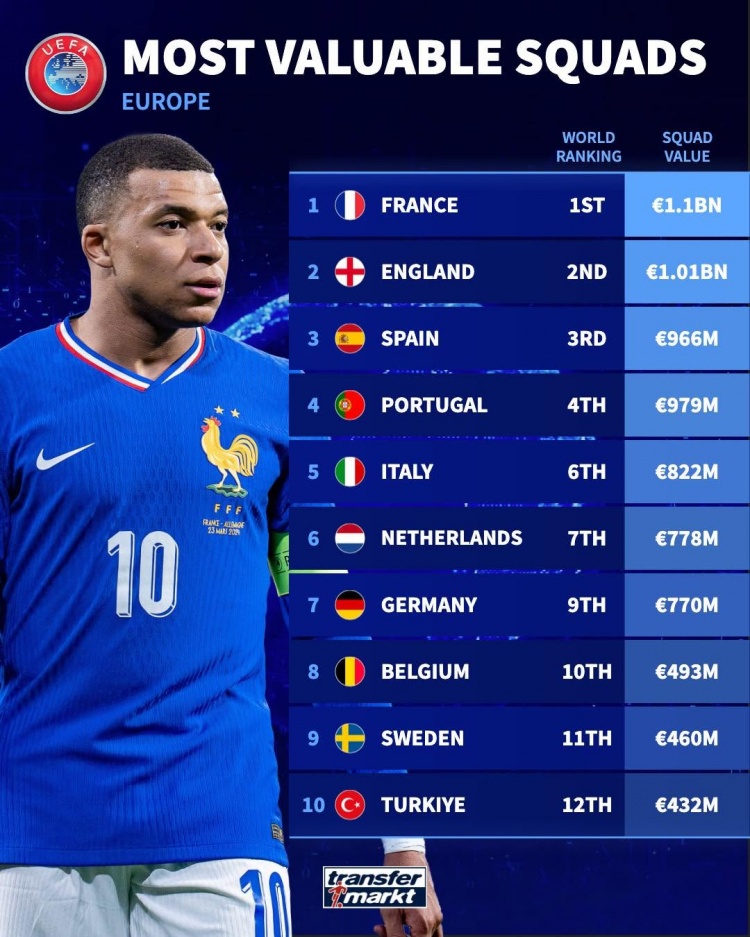 根據德國轉會市場網最新發布的歐洲國家隊身價排名,法國國家隊以總身價高達11億歐元穩居首位。緊隨其後的是英格蘭隊,身價達10.1億歐元,排名第二;而西班牙隊則以9.66億歐元的身價位列第三。整體來看,這一排名反映了各國球員在市場上的估值狀況。
