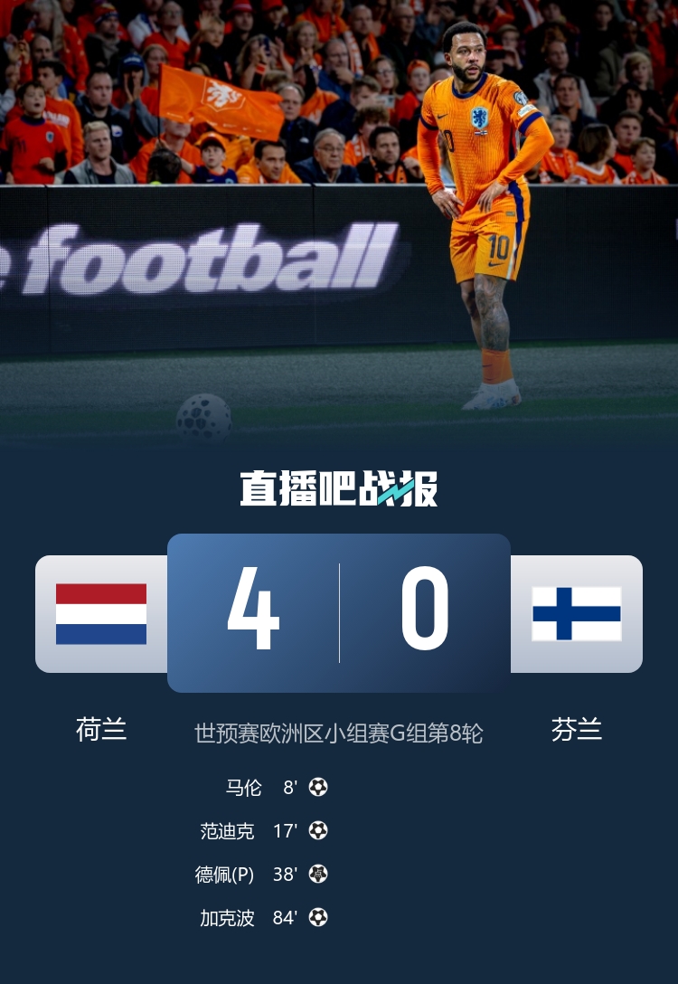 10月13日的比賽在北京時間0:00正式開啟,這場世預賽歐洲區G組的較量在約翰克魯伊夫競技場進行,荷蘭對陣芬蘭。比賽精彩紛呈,荷蘭隊以4-0的絕對優勢取得勝利,繼續在G組穩居領先地位,五勝一平的不敗戰績讓他們信心滿滿。