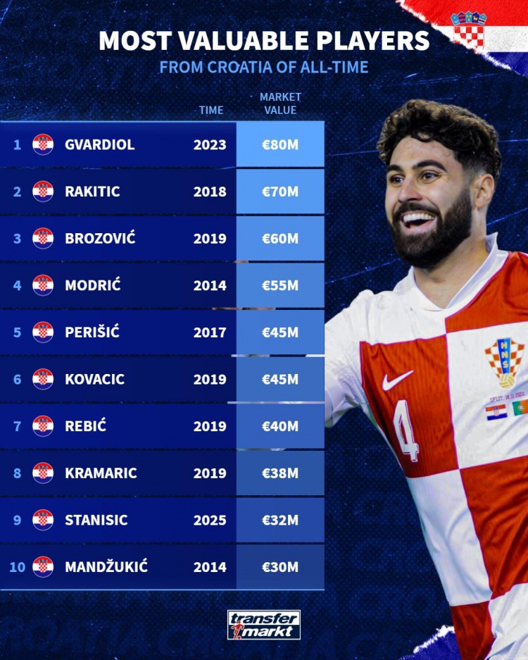 在足球這片璀璨的天地中,克羅地亞以其獨特的足球風格和出色的球員素質,屢屢贏得贊譽。近日,德國轉會市場對克羅地亞球員的歷史最高身價進行了統計,令人矚目的是,格瓦迪奧爾以8000萬歐元的身價高居榜首,展現了他在綠茵場上的卓越才能。