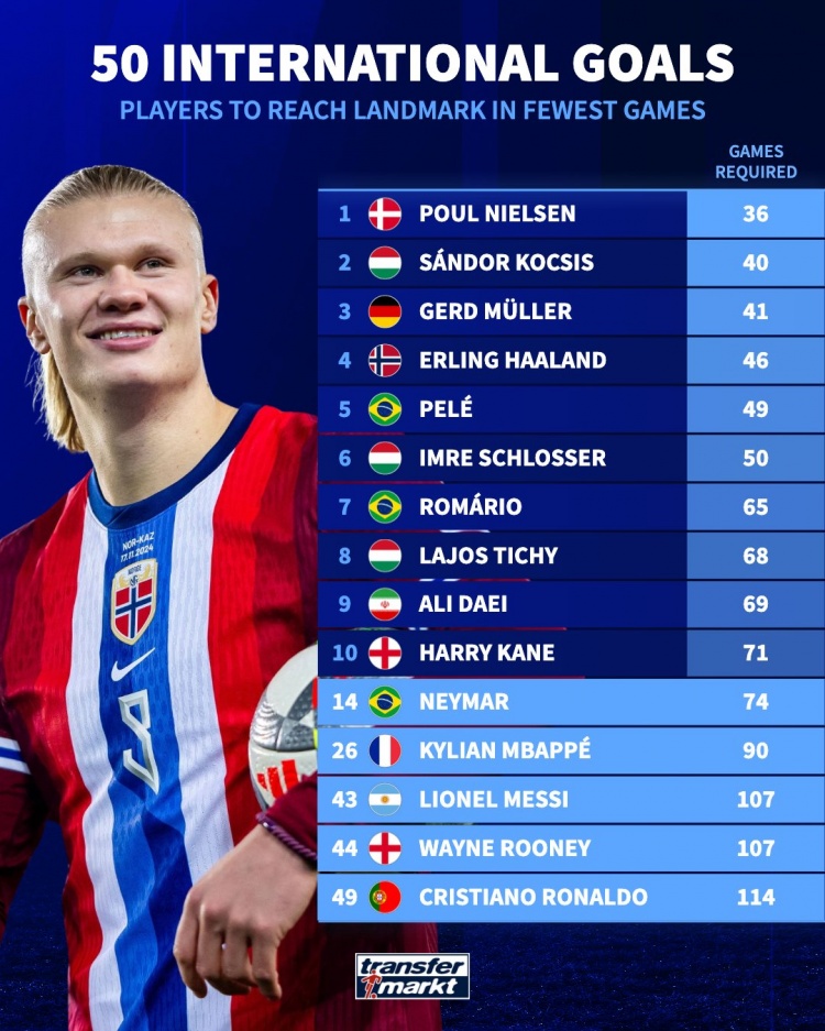 從上面的數據中可以看出,哈蘭德以46場的成績,位列第四,顯示了他在國際賽場上的強大進攻能力和高效的得分效率。這一表現不僅鞏固了他的地位,也讓人們對他在未來的表現充滿期待。與歷史上其他傳奇球員相比,哈蘭德的進球率是相當驚人的,這也為他在國際舞臺上的持續影響力奠定了基礎。