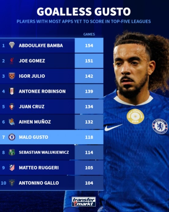 而當我們看到皇家社會的穆尼奧斯以132場和切爾西的古斯托以118場名列其中,似乎證實了一個理論:只要在場上混就能上榜,不管表現如何。薩索洛的瓦盧凱維奇和馬競的魯傑裏也分別以114場和105場躋身前十,最後是萊切的賈洛,他也以104場緊隨其後。