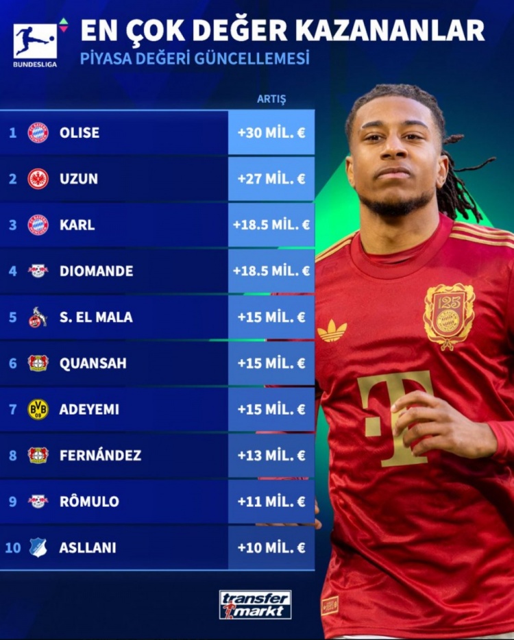 首先,奧利塞來自拜仁,以3000萬歐元的漲幅位居榜首,確實顯示了他的出色表現和潛力。其次,烏尊的成長速度也讓人刮目相看,2700萬歐元的上漲證明了他在法蘭克福的卓越貢獻。